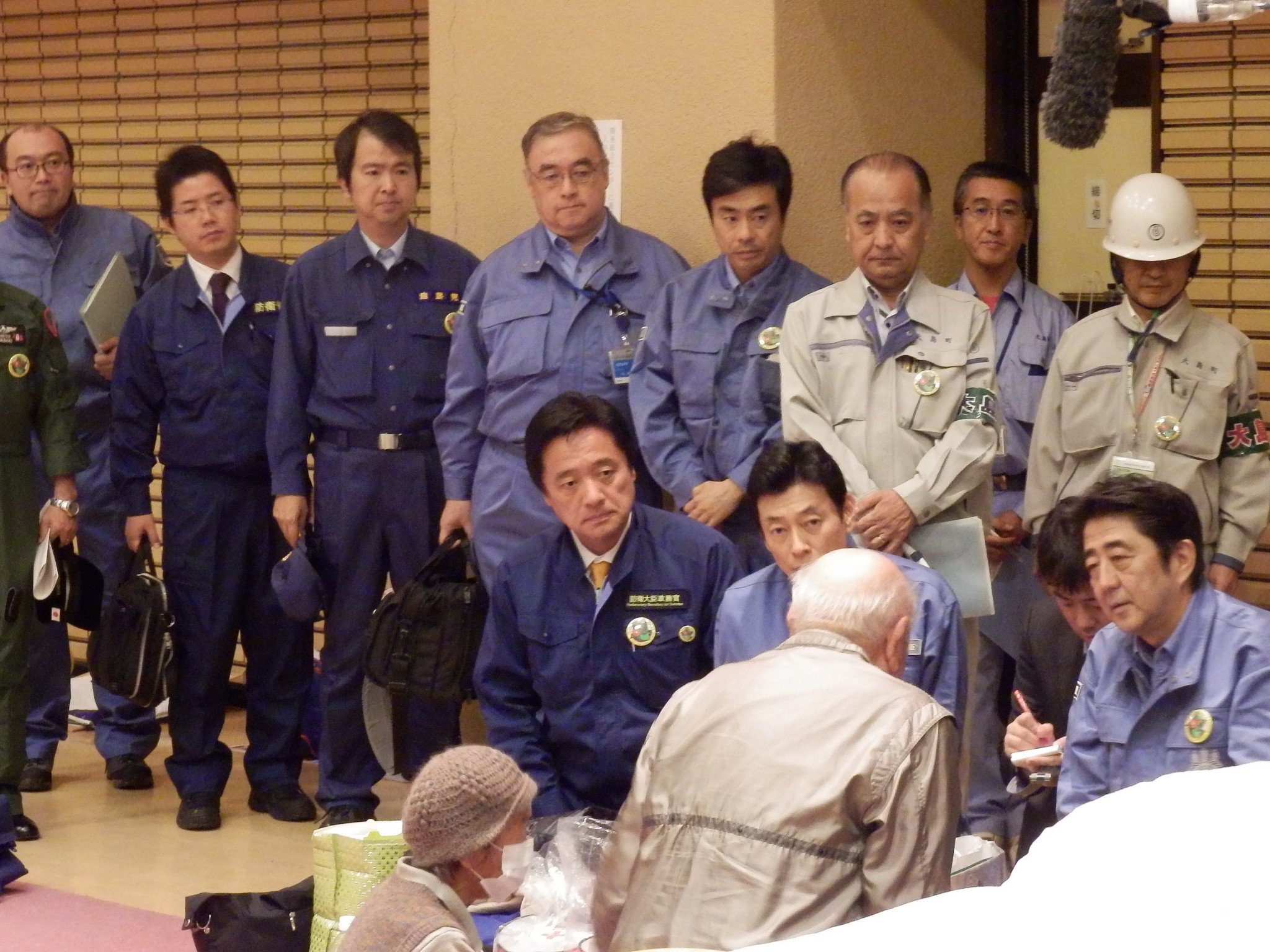 10月27日(日)、大島に来られた安倍総理と災害現場の視察、前田東京都副知事、川島町長との災害状況報告会議に参加しました。総理はインタビューの中で、行方不明者の捜索の強化、激甚災害指定の早急化を述べられました。29日の閣議で、農地等の復旧事業に関する激甚災害、中小企業関係の激甚災害指定が成されました。迅速な政府の対応に感謝です。